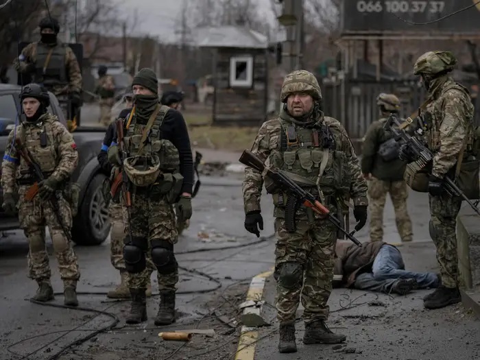 Các binh sĩ Ukraine trên đường phố Bucha, ngoại ô Kiev. Ảnh Reuters.