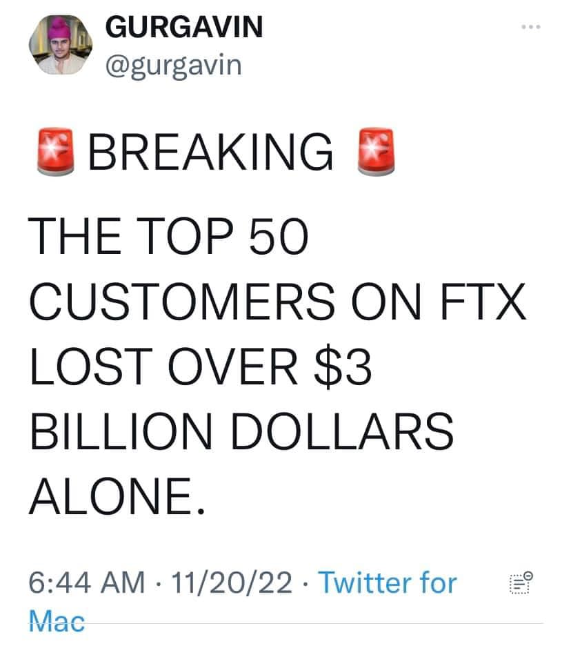 -120 hảng làm ăn chung với Ftx đồng loạt khai phá sản. Chị riêng 50 khách hàng lớn của Ftx mất trắng 3 tỷ. Trong số này có tài tử xi nê gạo cội, những tay vận động thể thao nổi tiếng. It nhất 100 ngàn người giàu có trắng tay.