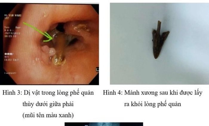 Bệnh nhân được điều trị kháng sinh tích cực, khi tình trạng nhiễm trùng ổn định, bệnh nhân được nội soi phế quản ống mềm, phát hiện dị vật là mảnh mỏ gà có kích thước lớn, hình dạng 3 cạnh thành sắc trong lòng phế quản thùy dưới phổi phải, một cạnh găm vào thành phế quản.