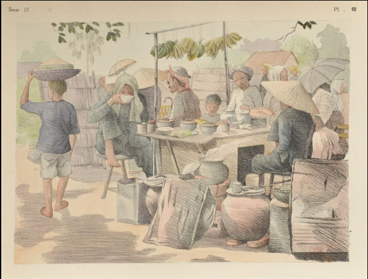 Tranh khắc họa khung cảnh quán nước chè ở chợ, với trang phục đặc trưng thời bấy giờ.