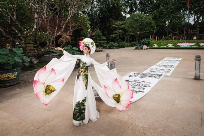 Thiết kế do Top 6 Miss International Queen Vietnam Nguyễn Vũ Hà Anh thể hiện với tà trước vẽ hoa sen quê Bác, còn tà sau dài 20 mét phác họa lại những nơi mà Bác từng làm việc như Bến Nhà Rồng, Lán Nà Nưa, Nhà sàn Bác Hồ, Quê nội của Bác cùng những đầm sen…