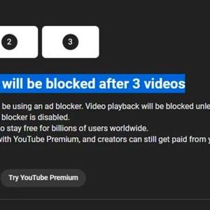 Một số tài khoản YouTube khắp toàn cầu đã và đang nhận được thông báo "trình phát video của bạn sẽ bị khóa sau 3 video" khi cài phần mềm chặn quảng cáo YouTube.