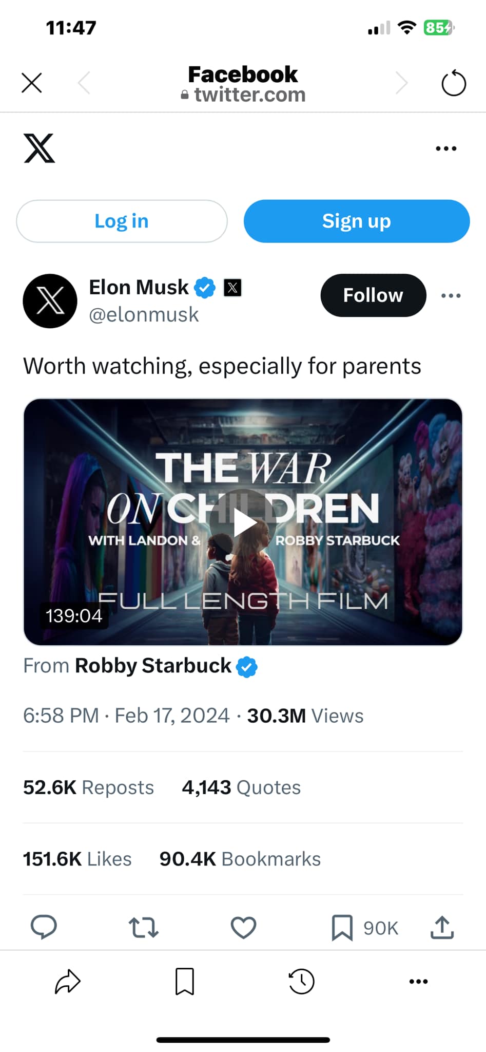 Đây là phim có trả tiền. Nhưng đặc biệt theo lời yêu cầu của Elon Musk, người làm phim, ông Robby Starbuck cho xem miễn phí trong vòng 12 giờ. Tựa phim là The war on Children, Chiến tranh trên trẻ em.