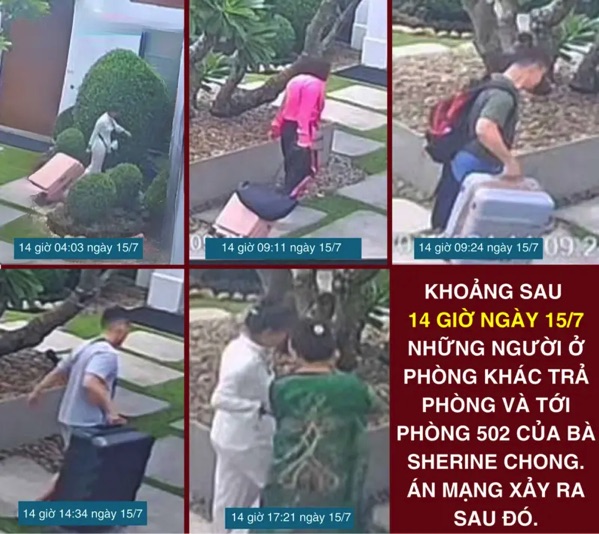 Tới quá 14 giờ một chút, những người ở các pḥng khác nhau trả pḥng và di chuyển xuống pḥng 502 ở lầu 5, nơi bà Sherine Chong đang ở.