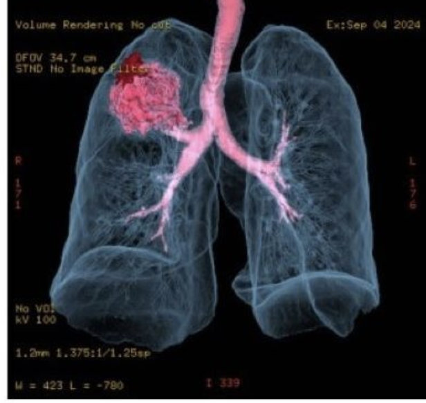 Nghi ngờ có khối u ác tính, bác sĩ đã chỉ định bệnh nhân chụp CT phổi liều thấp và phát hiện tổn thương u thùy trên phổi phải, kích thước lớn, đường bờ tua gai co kéo màng phổi vùng tương ứng quanh u. Dựa vào các kết quả trên, bệnh nhân được chẩn đoán u thùy trên phổi phải, theo dõi ung thư phổi di căn. Bệnh nhân đã được chuyển viện tới viện Chợ Rẫy thực hiện quá trình điều trị theo chuyên khoa.