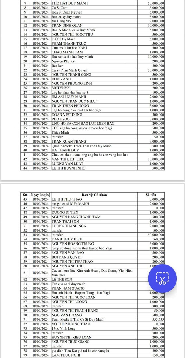 Cũng trong bảng sao kê ủng hộ từ các tài khoản này, có nhiều trường hợp được ghi nhận là “thân nhân” của ca sĩ Duy Mạnh - người vừa thống nhất với ca sĩ Tuấn Hưng sẽ tổ chức một đêm nhạc từ thiện để giúp đỡ bà con vùng bão lũ trong những ngày tới.