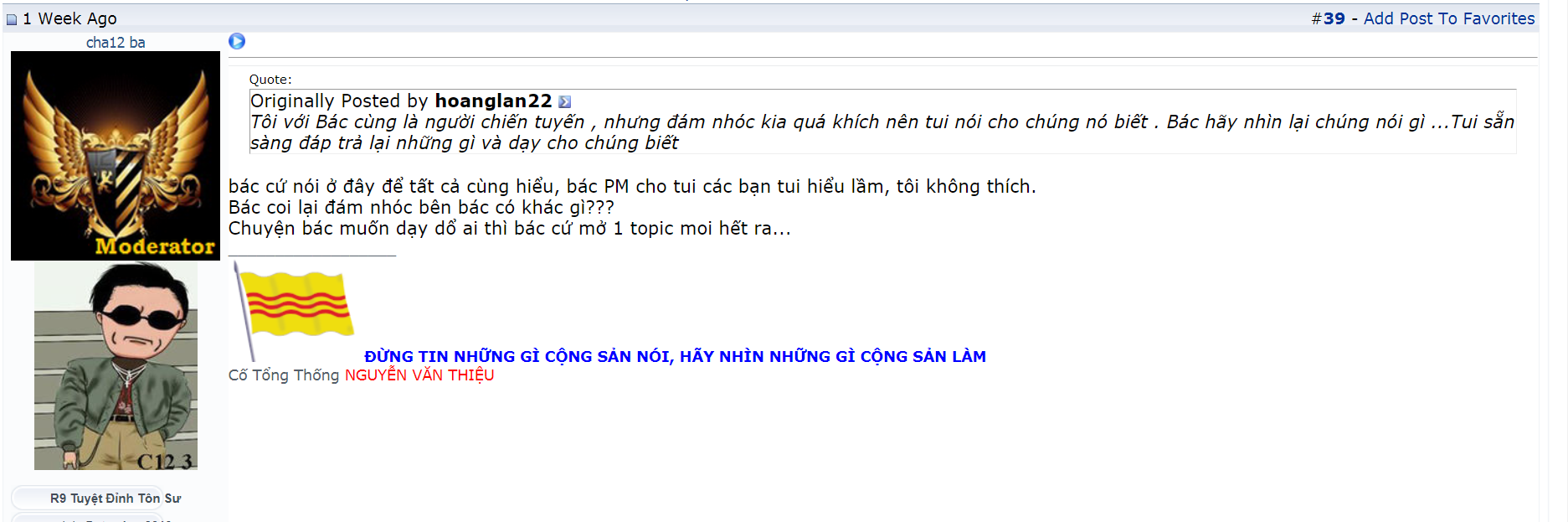 khi tui làm việc thì không nể bất cứ ai . cái gì đáng là tui làm .Những thành viên ủng hộ TT trump hay không ủng hộ với lời lẽ quá khích tui xóa sạch . Trong trường hợp tui có gì sai thì đưa vào phần góp ý và nêu ra những điểm chính chứ không phải chỉ trich ở các com trong các Thread , dĩ nhiên tui sẽ phang lại rồi đừng dựa vào đó là MOD làm chuyện này độc tài etc ..ai chửi bạn hay chỉ trích thì họ có quyền phán kháng tùy theo ngôn từ họ dùng ngay cả MOD cũng vậy . Nhiều khi thấy MOD phản kháng thì lập luận của họ là MOD ăn nói .. vậy sao không dùng mục góp ý ???? đây là cái điều họ thiếu ý thức gây chuyện làm forum xáo trộn