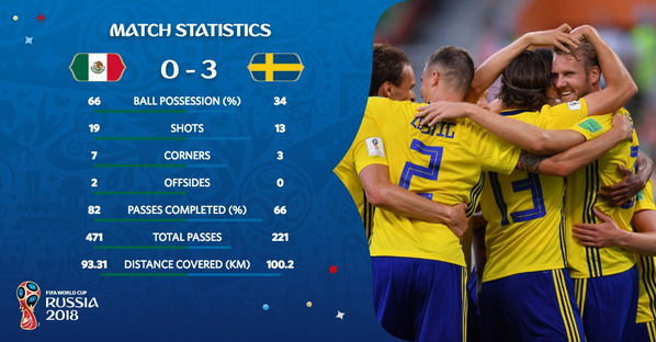 Như vậy Thụy Điển dẫn đầu bảng với 6 điểm. Thụy Điển và Mexico sẽ đi tiếp, Đức và Hàn rơi. Đức phải dồn lên tấn công.