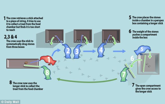 Sơ đồ này cho thấy quạ hoàn thành thử thách 8 giai đoạn trong khoảng 2 phút rưỡi (Ảnh: Daily Mail)