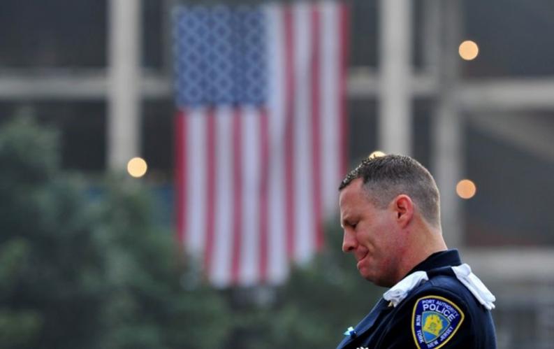 Một sĩ quan cảnh sát New York tại khu vực tưởng niệm. Sở Cảnh sát New York cũng tổ chức sự kiện tưởng nhớ hơn 70 chiến sĩ đồng đội hy sinh lúc vụ tấn công xảy ra và trong quá trình cứu nạn cách đây 15 năm.