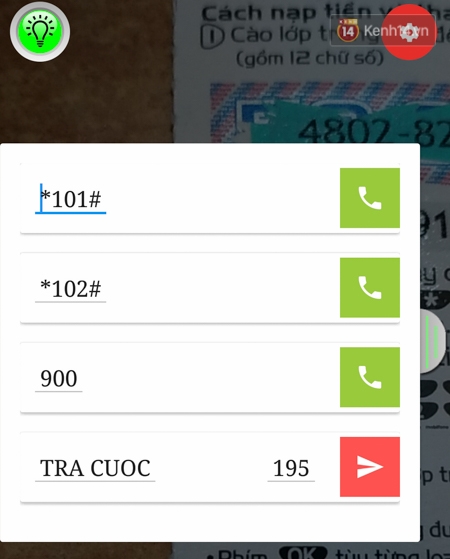 Vuốt sang trái để hiện bảng nhỏ này, bạn có thể kiểm tra tài khoản hoặc gọi lên tổng đài một cách nhanh chóng.