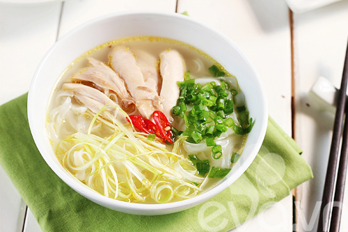 Khi ăn, chần bánh phở từng bát, thêm thịt gà, hành hoa… vào bát rồi chan nước dùng lên trên.