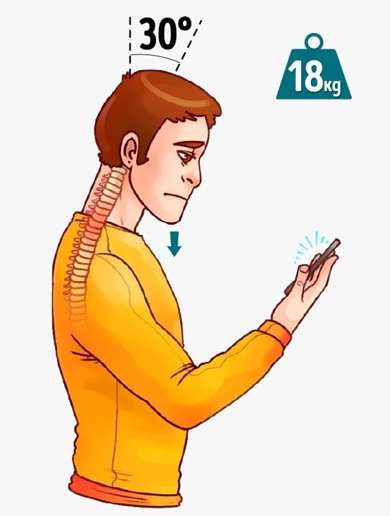 Theo Bright Side, ngày nay xu hướng sử dụng smartphone và các thiết bị cầm tay nhiều giờ trong ngày rất phổ biến. Khi bạn cúi thấp đầu xuống khoảng 30 hoặc 600 , áp lực dồn vào cột sống, gây ảnh hưởng đến phổi và một số cơ quan khác.