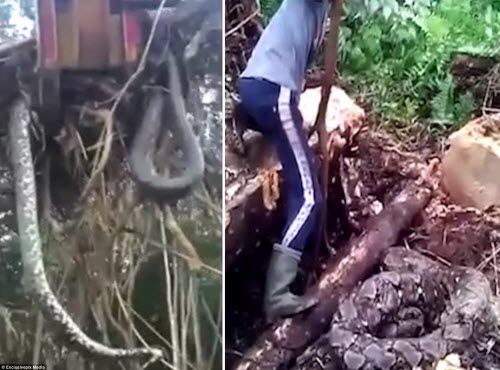 Các công nhân xây dựng đang dùng máy xúc để nhổ cây cao su tại một công trường xây dựng (theo Daily Mail là ở Việt Nam), thì họ bất ngờ phát hiện con trăn khổng lồ dài khoảng 6m lủng lẳng giữa đám rễ cây được nhấc khỏi mặt đất.