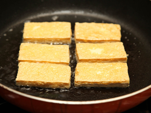 Khi bắt đầu rán đậu, bạn cần phải đảm bảo dầu ăn đủ nóng. Vì không phải là chảo chống dính, nên bạn có thể cho chảo lên đun thật nóng rồi mới cho dầu (mỡ) vào chảo, để thêm một lúc rồi cho đậu vào. Hoặc bạn cũng có thể đợi chảo khô rồi đổ dầu (mỡ) vào, đun nóng già. Nếu dầu ăn chưa đủ nóng, khi cho đậu vào rán, đậu sẽ bị dính chảo. Hơn nữa, dầu nóng, vỏ bên ngoài của đậu sẽ vàng giòn, đẹp mắt. Lưu ý, dầu mỡ cho vào chảo nên ngập ít nhất 1/4-1/3 miếng đậu.