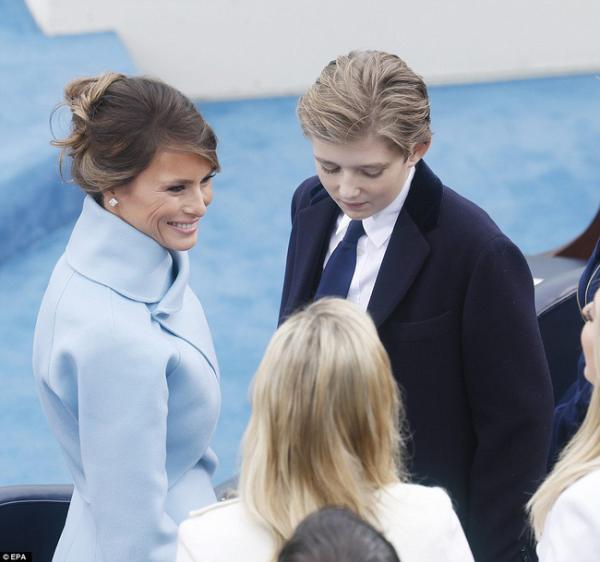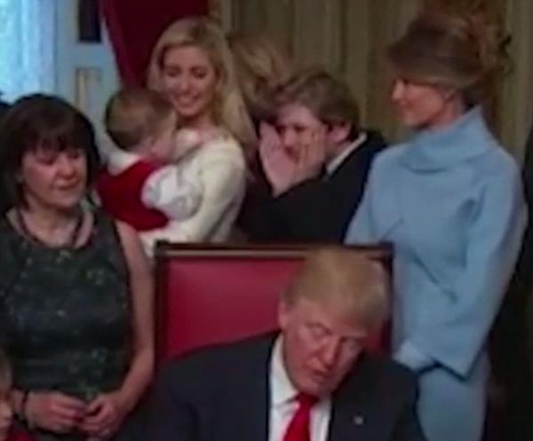 Khi cha giành chiến thắng trong cuộc đua vào Nhà Trắng, cậu út nhà Trump lại có vẻ mặt buồn ngủ gây chú ý. Trong lễ nhậm chức của cha ngày 20.1, cậu lại làm trò sau lưng tổng thống đắc cử. Barron Trump vô tư trêu đùa và chơi với cháu ngay trong buổi phát sóng trực tiếp.