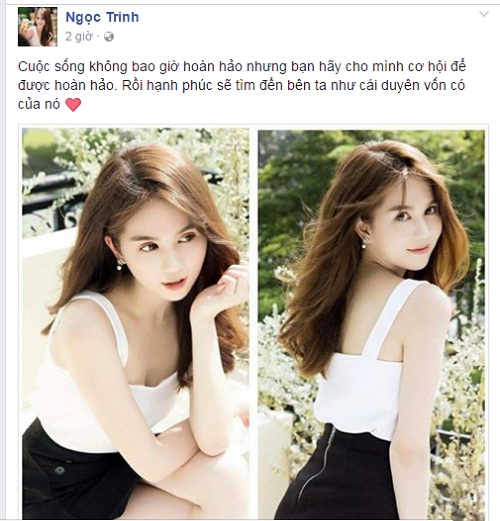 Một hình ảnh khác của Ngọc Trinh được cô chia sẻ cách đây ít giờ kèm lời nhắn gửi: "Cuộc sống không bao giờ hoàn hảo nhưng bạn hãy cho mình cơ hội để được hoàn hảo. Rồi hạnh phúc sẽ tìm đến bên ta như cái duyên vốn có của nó".