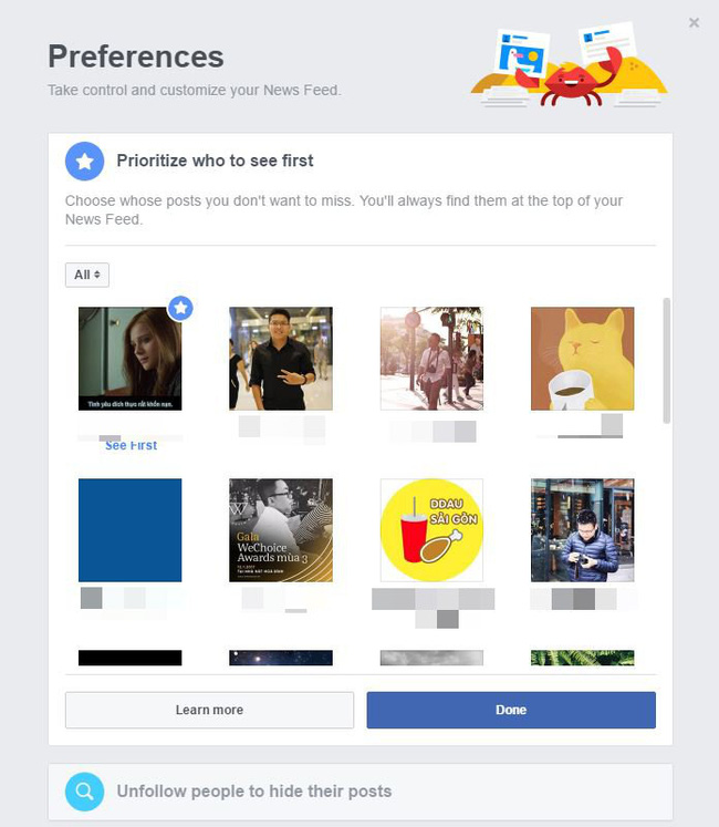 Với việc có hàng trăm bạn bè trên Facebook, hẳn mỗi ngày bạn phải mệt mỏi với việc lướt qua nhiều thông tin nhảm nhí hoặc không quan trọng từ những người bạn "chẳng biết là ai". Để khắc phục tình trạng này và có thể nắm bắt được những thông tin mới nhất từ bạn bè thân thiết, bạn có thể tùy chỉnh lại cách Facebook hiển thị ở News Feed bằng cách vào News Feed Preferences, chọn Priorities who to see first để ưu tiên những ai bạn muốn xuất hiện trước.