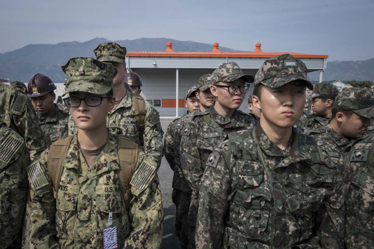 Binh sĩ Mỹ và Hàn Quốc tham gia tập trận chung tại Jinhae hôm 13-3 Ảnh: Hải quân Mỹ