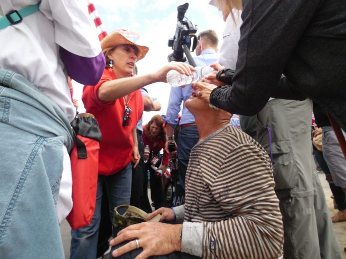 Bà Lori Heston, 65 tuổi, từ vùng Inland Empire đến, tham dự cùng cô con gái, Jessica French, tại một lều, cho biết: “Thấy mọi người tụ họp tỏ tình đoàn kết và yêu nước, tôi rất vui. Chồng tôi là lính Thủy Quân Lục Chiến Hoa Kỳ.”