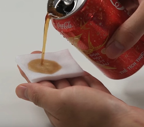 Chỉ cần đổ 1 chút nước coca lên mặt vải bị dính cao su, ngay lập tức bạn có thể tách bỏ chúng một cách dễ dàng chỉ trong 2 phút.