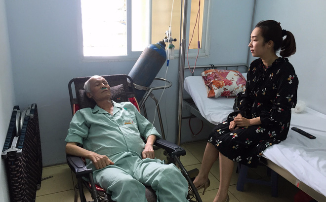Chị Hồng Anh, con gái nghệ sĩ Duy Thanh bên giường bệnh của bố. Ảnh: Kiến thức