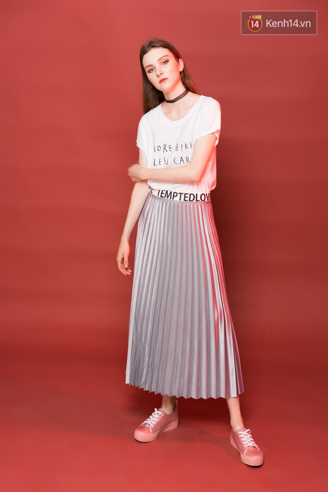 Công thức "đinh" với áo phông trắng in chữ mà nàng nào cũng nên "khắc cốt ghi tâm" trong hè này chính là diện cùng với chân váy midi và giày sneaker.