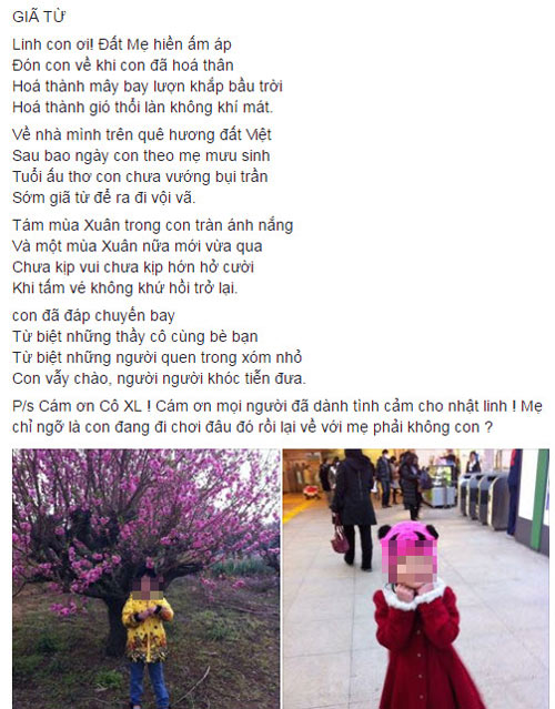 Trước đó ít ngày, chị Nguyên cũng chia sẻ dòng trạng thái đầy đau thương về clip hé Linh hát ru em bằng tiếng Nhật. Chị viết: ""Em Tú nhớ con lắm Linh ơi! Bố mẹ cũng nhớ con lắm! Tiếng con hát ru em, tiếng con cười.... nay còn đâu? Con theo bố mẹ tha hương nơi xứ người. Bố mẹ mong con có 1 tương lai tươi đẹp mà giờ sao lại thế này?