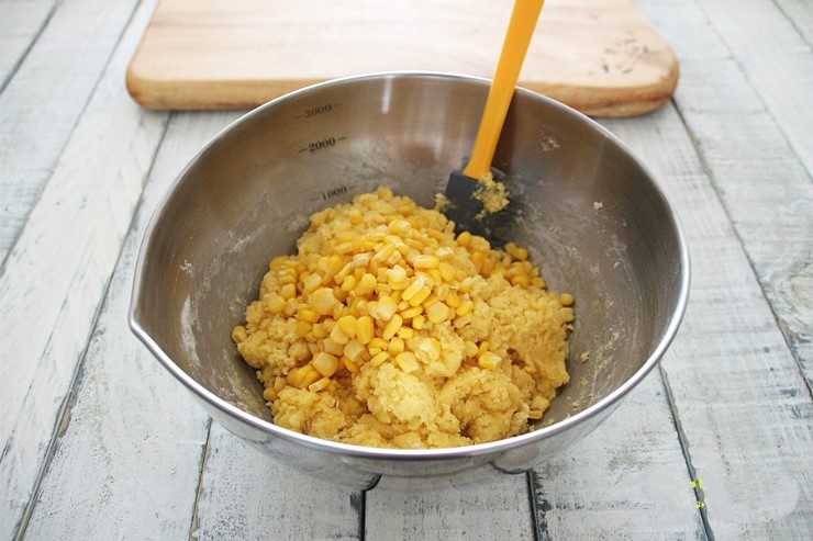 Đập trứng vào âu, thêm sữa tươi vào đánh tan. Rây bột mì, bột ngô vào âu một âu khác, thêm muối, đường, bột nở rồi dùng phới lồng trộn đều. Sau đó đổ bột vào âu trứng sữa.