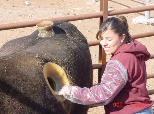 Thoạt nhìn một lỗ thủng rất lớn ở trên thân con bò có thể sẽ khiến bạn rùng mình.Người chăn nuôi bò sữa có thể đưa tay vào bụng bò qua cái lỗ này.Vậy họ tạo ra một chiếc lỗ như vậy để làm gì?