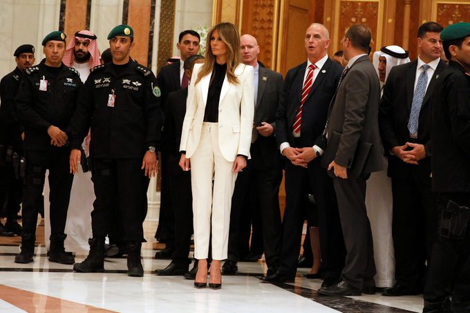 Khi đặt chân đến Riyadh, thủ đô Arab Saudi và tiếp chuyện Thái tử Muhammad bin Nayef hôm 20/5, bà Melania lựa chọn bộ jumpsuit Stella McCartney kín đáo có giá 1.047 USD, đai lưng Saint Laurent 348 USD.