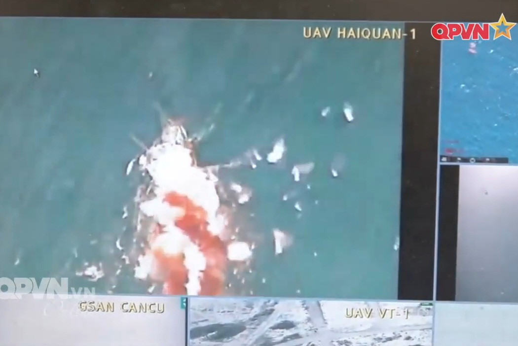 Ở pha cuối tên lửa hạ thấp độ cao xuống dưới 100m trước khi lao đến mục tiêu với tốc độ siêu âm Mach 1,4. Trong ảnh, UAV của Hải quân Việt Nam ghi lại khoảnh khắc tên lửa P-35B đánh trúng tàu mục tiêu. Nguồn ảnh: Kênh QPVN