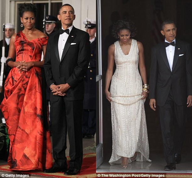 Bà Michelle cho rằng trong khi bà bị chú ý tới từng chiếc váy và phụ kiện thì ông Obama lại chẳng bị ai phát hiện ra bí mật trong cách ăn mặc của mình. Bức ảnh được chụp vào năm 2009 (trái) và năm 2010 (phải).