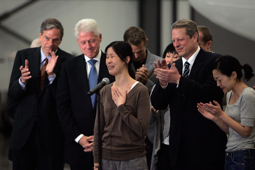 Trước đó, Triều Tiên từng chỉ đồng ư thả người sau khi cựu tổng thống Bill Clinton (thứ 2 từ trái sang) và cựu phó tổng thống Al Gore (thứ 2 từ phải sang) đến thăm vào năm 2009. Trong ảnh là hai nhà báo Laura Ling (đứng trước micro) và Euna Lee (ngoài cùng bên phải) khi họ đoàn tụ với gia đ́nh ở Mỹ sau 140 ngày bị giam giữ tại Triều Tiên v́ tội nhập cảnh trái phép. Ảnh: Getty.