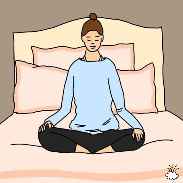 1. Ngồi xếp bằng trên giường, cột sống thẳng, cánh tay thoải mái, cộng với ba lần thở sâu. Thở nên chậm và nhịp nhàng.