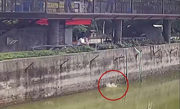 Khoảng vài giây sau, không hiểu vì lý do gì mà chú chó nhỏ lại bị mất thăng bằng và ngã nhào xuống hào nước bên dưới.