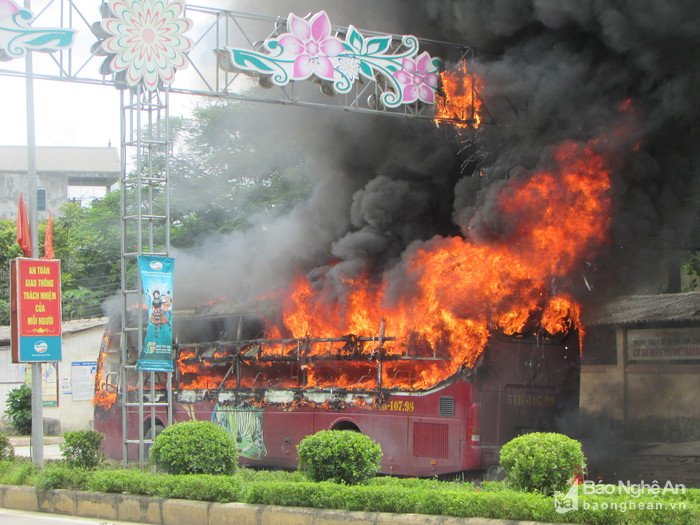 Xe khách giường nằm BKS 51B - 107.98 đang dừng ăn trưa thì ngọn lửa bốc lên từ phần máy phía trước xe và nhanh chóng bao trùm toàn bộ xe. Sau vụ cháy chiếc xe chỉ còn trơ khung sắt.