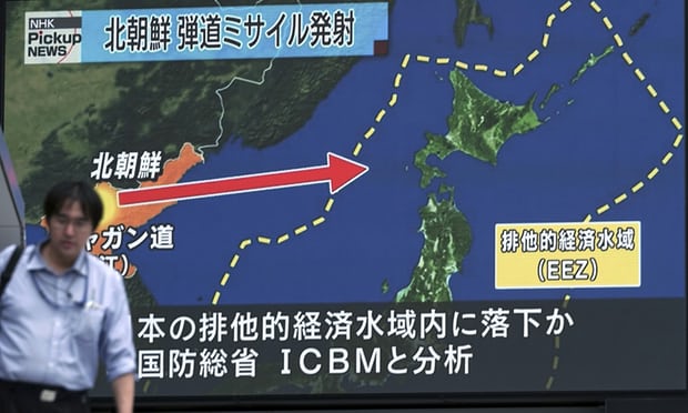 Truyền hình Nhật Bản đưa tin về vụ phóng tên lửa mới nhất của Triều Tien (Ảnh: Guardian)