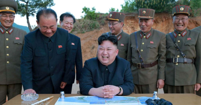Lãnh tụ Triều Tiên Kim Jong Un phản ứng trong vụ phóng tên lửa đạn đạo tầm xa Hwasong-12 trong một bức hình không đề ngày tháng do Thông tấn xã Trung ương Bắc Triều Tiên công bố vào ngày 15 tháng 5, 2017.