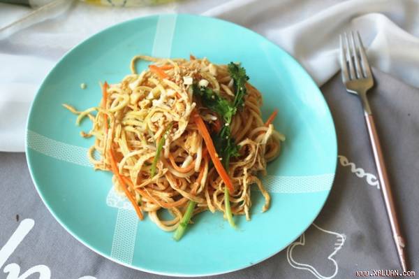Cho mì ra tô, thêm một ít dầu mè vào trộn đều. Tiếp đó thêm thịt gà, dưa chuột, cà rốt vào. Thêm bơ vừng, nước tương, dầu hào, giấm, vừng rang và lạc rang giã dập và chút rau mùi vào trộn đều là xong.