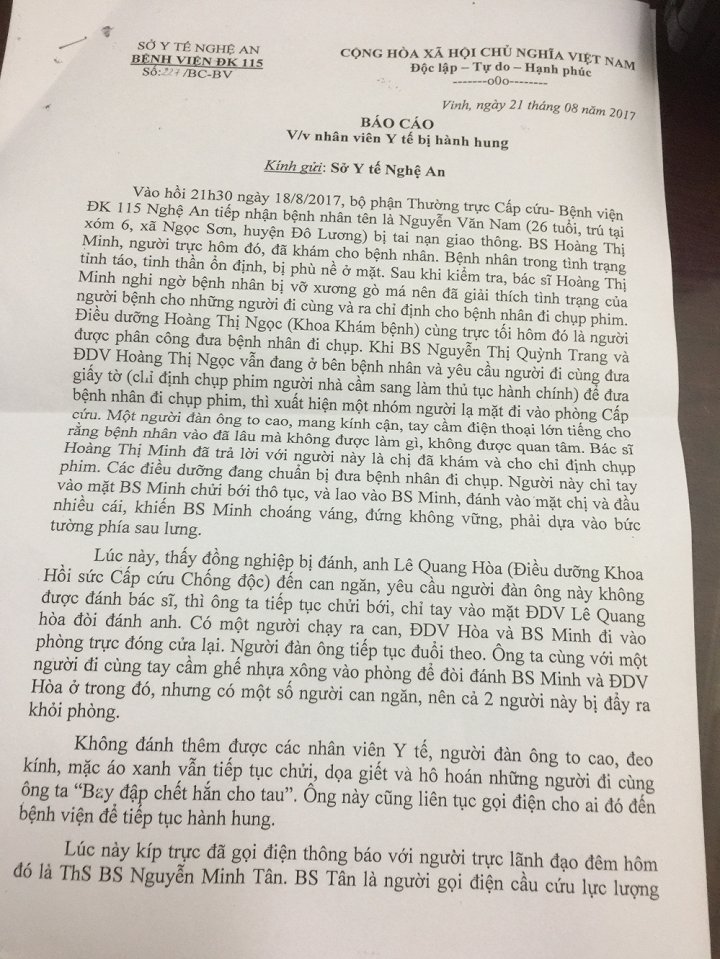 Riêng đối với ông Nguyễn Hoàng Đình Thắng, Chủ tịch HĐQT công ty xây lắp Tân Thắng, Nghệ An người trực tiếp đánh bác sỹ hôm tối 18/8 cũng đã tường trình sự việc với cơ quan chức năng, đồng thời ông Thắng cũng đã xin lỗi các bác sỹ, nhân viên Bệnh viện 115 Nghệ An.