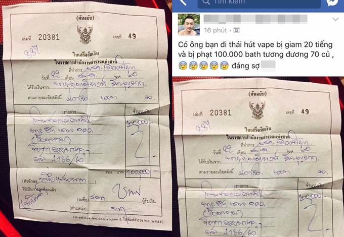 Theo chia sẻ của bạn người này trên Facebook, người hút thuốc lá điện tử đã bị tạm giam 20 giờ ở sở cảnh sát, sau đó nhờ người quen đang định cư ở Thái Lan bảo lãnh với số tiền 100.000 baht (tương đương 70 triệu đồng) để được tại ngoại. Tuy nhiên, hai tháng sau, anh ta phải quay trở lại Thái để có mặt trong buổi xét xử và nộp phạt số tiền không nhỏ. Nếu không xuất hiện trong phiên tòa, người này sẽ bị cấm nhập cảnh vĩnh viễn vào Thái Lan.