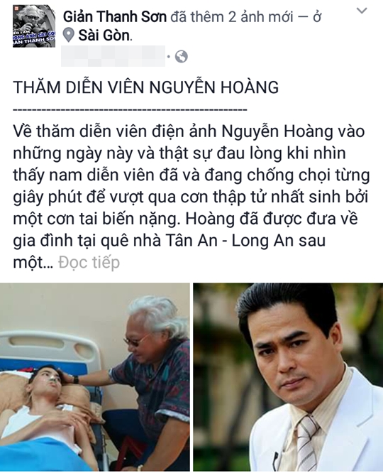 Mới đây, nhiếp ảnh gia Giản Thanh Sơn đã đăng tải hình ảnh đi thăm diễn viên Nguyễn Hoàng trên trang cá nhân cùng lời chia sẻ: "Về thăm diễn viên điện ảnh Nguyễn Hoàng vào những ngày này và thật sự đau lòng khi nhìn thấy nam diễn viên đã và đang chống chọi từng giây phút để vượt qua cơn thập tử nhất sinh bởi một cơn tai biến nặng. Hoàng đã được đưa về gia đình tại quê nhà Tân An - Long An sau một thời gian dài nằm điều trị ở Sài Gòn. Hiện Nguyễn Hoàng đang được Hồng và Hà (chị và em ruột) trực tiếp chăm sóc thuốc men..."