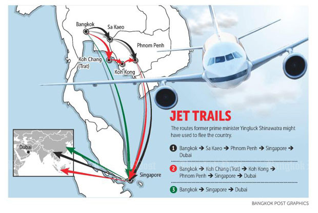 Một nguồn tin thân cận với gia đình Yingluck cho biết bà đã đi bằng máy bay riêng đến Trat, từ đó bà đi qua biên giới Thái Lan để sang tỉnh Koh Kong của Campuchia, nơi bà được những người thân tín hộ tống.