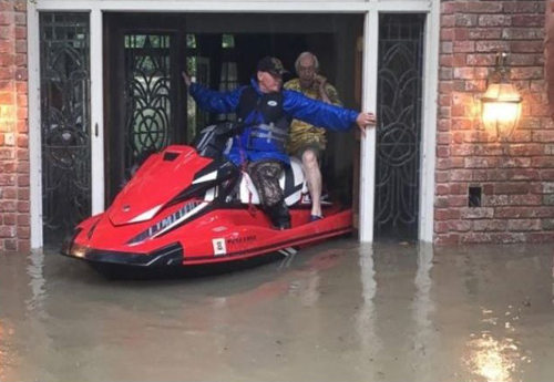 Ông J.C. Spencer ngồi sau chiếc mô-tô nước, ra khỏi căn nhà ngập nước do bão Harvey vào hôm 28/8