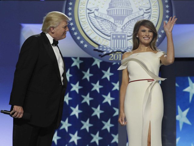 Bà Melania đầy kiêu sa và quyến rũ kh diện chiếc đầm trắng của hãng Herve Pierre trong tiệc khiêu vũ mừng lễ nhậm chức của chồng.
