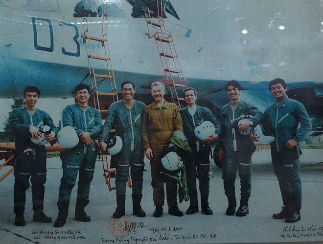 Viktor Geogiyevich Pugachev cùng 6 phi công tiêm kích Su-27 đầu tiên của Việt Nam. Từ trái qua phải: Nguyễn Văn Thận, Nguyễn Văn Phương, Nguyễn Đức Soát, Viktor Geogiyevich Pugachev, Trần Văn Thi, Đỗ Văn Đức, Vơ Văn Tuấn. Ảnh: Cục Chính trị Quân chủng PK-KQ
