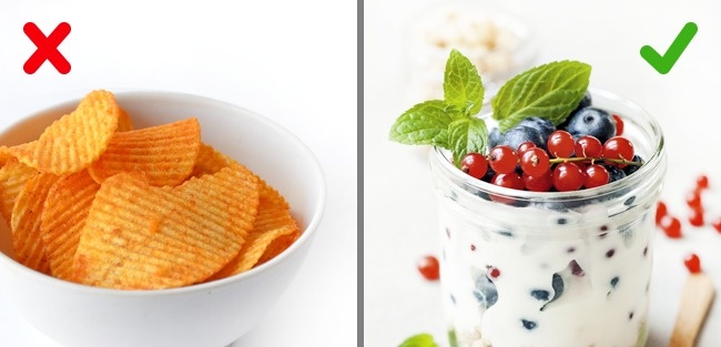 Đồ ăn vặt quá nhiều muối hoặc nhiều dầu mỡ không khiến bạn no bụng mà còn khiến bạn đói thêm. Nên chọn đồ ăn vặt lành mạnh, có lợi cho sức khỏe.