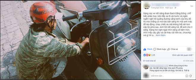 Mình cảm ơn và nói để gửi lại tiền cho anh, anh bảo anh có xăng thì giúp em chút, hồi em giúp lại người khác thôi mà có gì đâu. Ủa mà sao anh có sẵn chai xăng trên xe hay vậy, anh nói: ừ đường này vắng, ai mà hết xăng thì dắt bộ xa nắng mệt lắm, chút xăng có bao nhiêu đâu, mà mình giúp được người ta.
