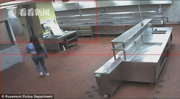 Một đoạn trong video cho thấy cô gái tự đi về phía tủ lạnh và xung quanh không có bất ḱ ai khác.